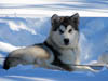 Solo came to us as a 5 year old dog from Nancy Russell of Storm Kloud Kennels, the only other malamute kennel in history to attempt the Iditarod. He is a sweet goofy guy, but had to learn our rules when he got here. He spent a lot of time upside-down before he realized that it was much more fun being right-side-up, and the rules he had to follow to remain upright:-) He is now a happy, productive, calm and responsive team member-and one of my hubby's favorite dogs!